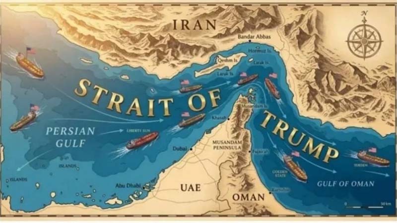 ইরানের সঙ্গে ক্রমবর্ধমান উত্তেজনা ও হরমুজ প্রণালিতে মার্কিন নৌ অবরোধ কয়েক মাস ধরে চলতে পারে এমন সতর্কবার্তার মধ্যে যুক্তরাষ্ট্রের প্রেসিডেন্ট ডোনাল্ড ট্রাম্প একটি পরিবর্তিত মানচিত্র শেয়ার করেছেন। যেখানে গুরুত্বপূর্ণ সমুদ্রপথ হরমুজ প্রণালির নাম পরিবর্তন করে ‘স্ট্রেইট অব ট্রাম্প’ বা ‘ট্রাম্প প্রণালি’ লেখা রয়েছে।